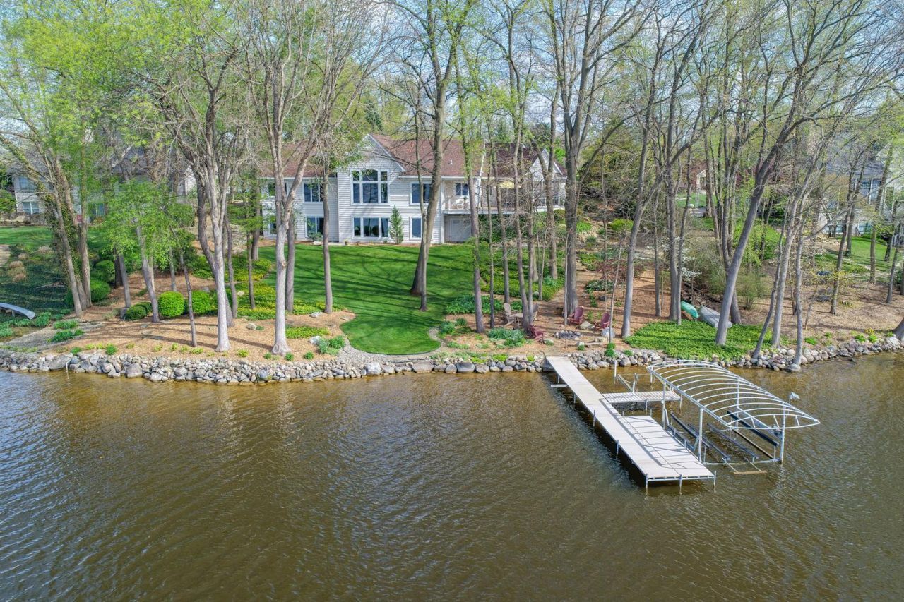 This five-bedroom, two-and-a-half-bath, 3,042-square-foot home overlooks all-sports Lake Templene from an elegant professionally landscaped gently sloping .63-acre wooded lot w/ 166 feet of waterfront, sandy beach, stone seawall, dock, waterside stone patio firepit. One-owner home, prime lot. 1,020-acre has 22 miles of shoreline, abundant wildlife, nature vistas, spectacular sunsets. Main level: living area w/ vaulted ceiling, gas log fireplace, panoramic views; kitchen w/ island, stainless appliances, custom cherry cabinets and copper range hood; dining area w/ panoramic views, access to large deck w/ 12x20 screened porch; primary bedroom w/ seating area, walk-in closet, and primary bath w/ dual vanities; an office/bedroom w/ vaulted ceiling; laundry; powder room. Downstairs: family room w/ wet bar, two bedrooms, office/bedroom, bath. Property includes oversized three-car attached garage, columned streetside entry, underground sprinkler.